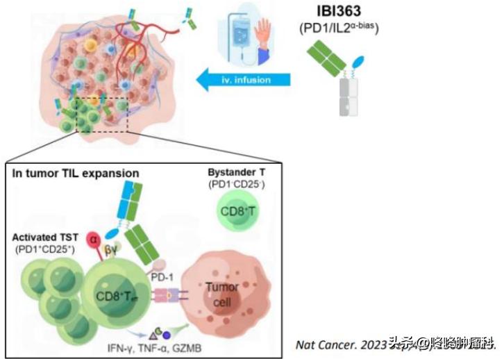 一端靶向PD-1,不但能通过抑制PD-1激活T细胞,还能借此靶向肿瘤;另一端则靶向IL-2的受体,在进入肿瘤后通过IL-2通路进一步激活免疫,产生更强的抗肿瘤免疫反应