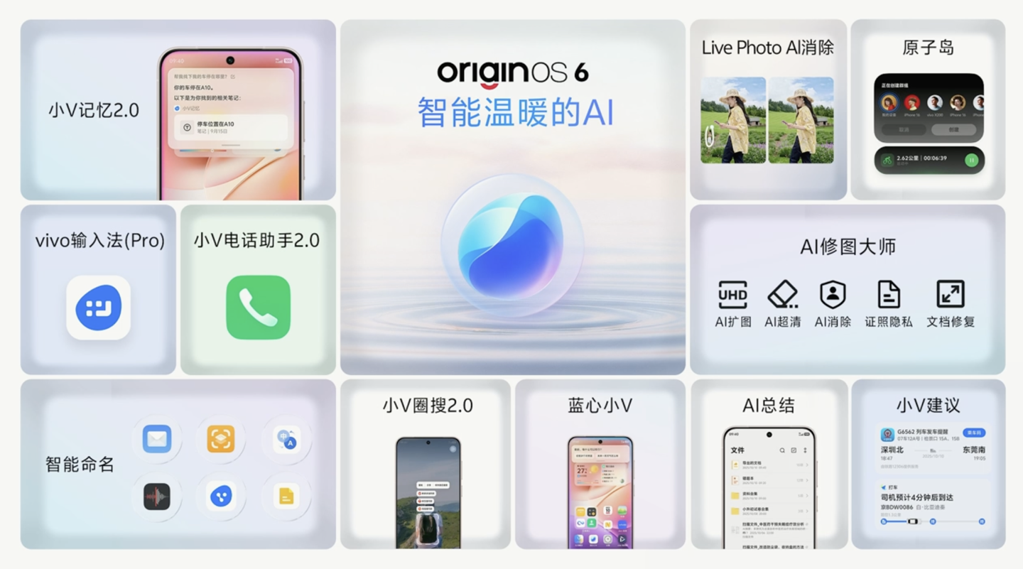 AI部分升级挺大。蓝心大模型更强了,能帮你记笔记、规划行程、存地址,甚至搞定旅游攻略。语音合成也更拟人,可以定制音色、同声传译,还能记住你的声音习惯。