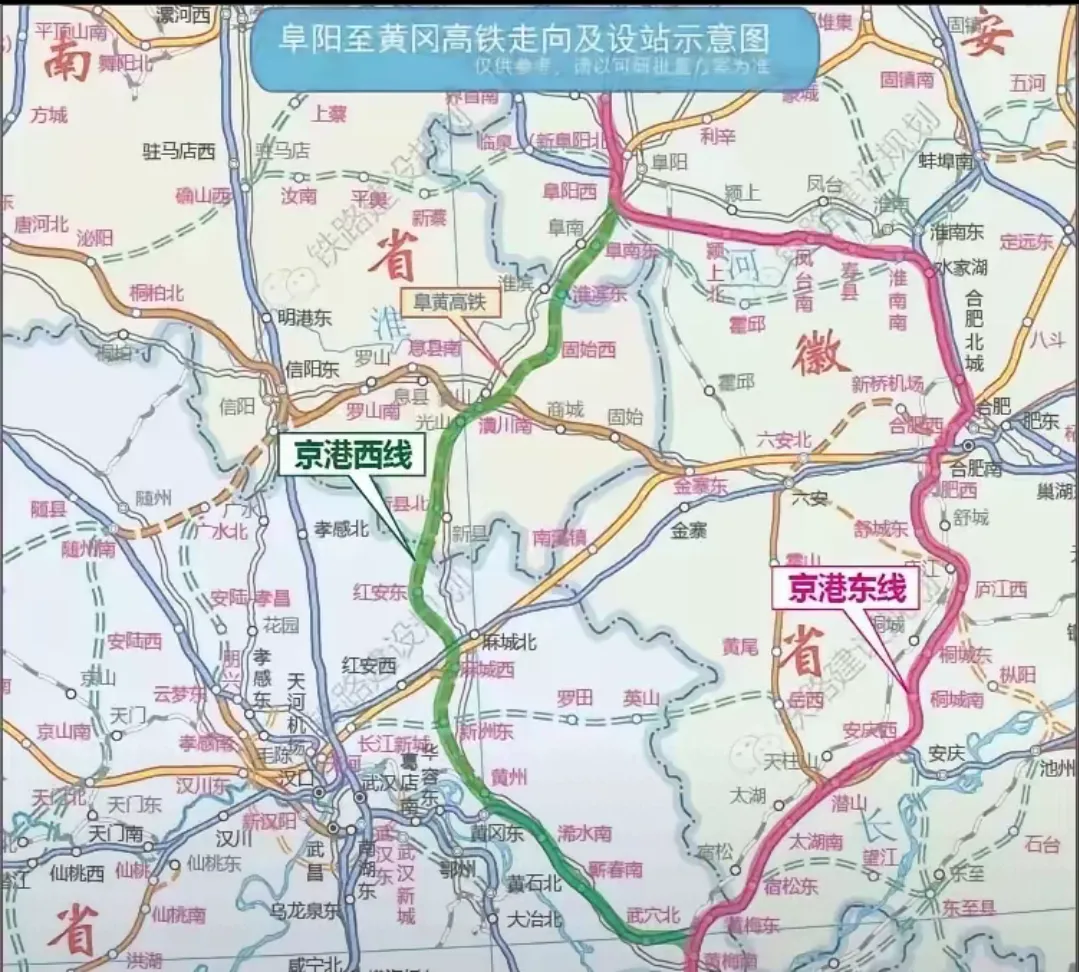 作为国家“中部崛起”战略的重要基础设施,阜黄高铁将激活豫东南、鄂东北的交通末梢。线路在阜阳西站可实现与郑阜、雄商、阜淮高铁的“十字”交汇,在潢川衔接规划中的南信合高铁,在黄冈通过巴河线路所与黄黄高铁贯通,最终形成纵贯中原的京九高铁西线通道。设站方案显示,固始、红安等远离京九铁路的县城正积极争取近城设站,其中固始西站选址距县城约15公里,有望结束这个百万人口大县“手无寸铁”的历史。“八纵八横”冲刺期的建设逻辑