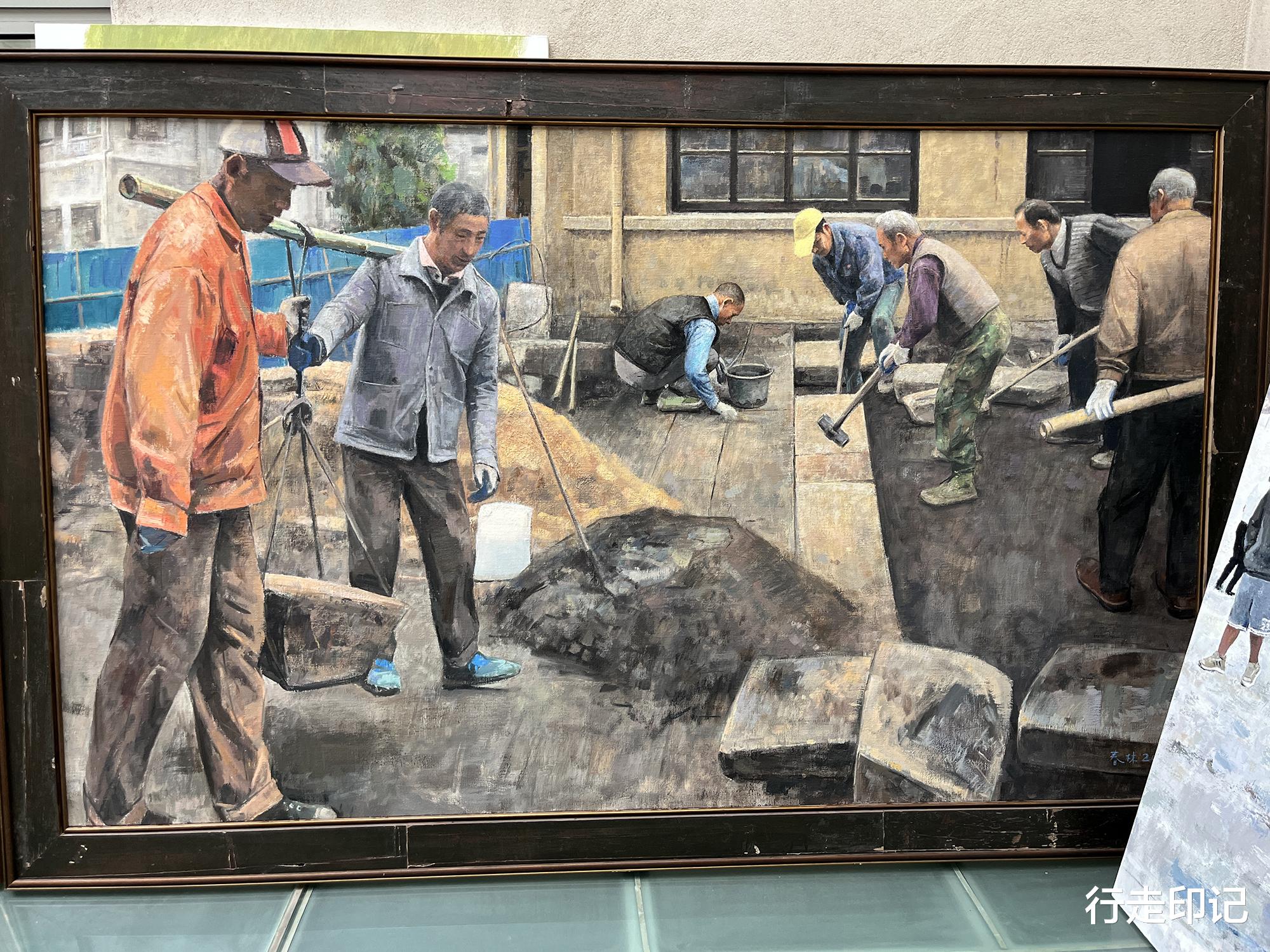 画面中工人们用石头铺砌道路,这是再简单不过的,日常可见的劳动场景。