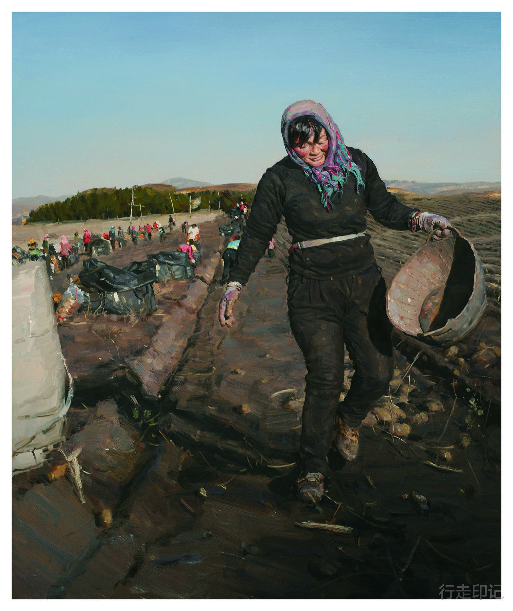 以农村收获的场景为背景,一位农村妇女的形象占据了大面积的画面,用这样一个高大的女性形象展现了土地的温暖与生命的力量,表达了艺术家对土地和劳动者的深深敬意。