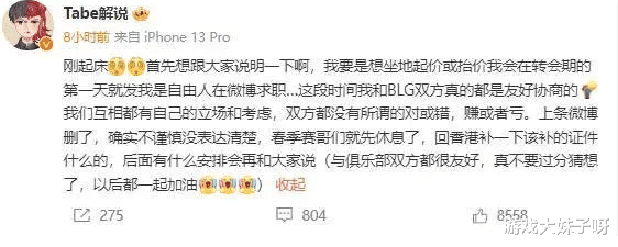 直到后来BLG管理层在粉丝群公开回应,直言Tabe在“坐地起价”,利用队伍已经拒绝其他教练、手上存在空缺的时机向俱乐部提额外要求,BLG的说法虽然没有官方声明的正式,但在圈内却引起大量震荡,面对指责,Tabe删除相关微博,并解释只是“立场不同,不存在对错”,然而,一旦风声传出,就很难再完全抚平质疑。