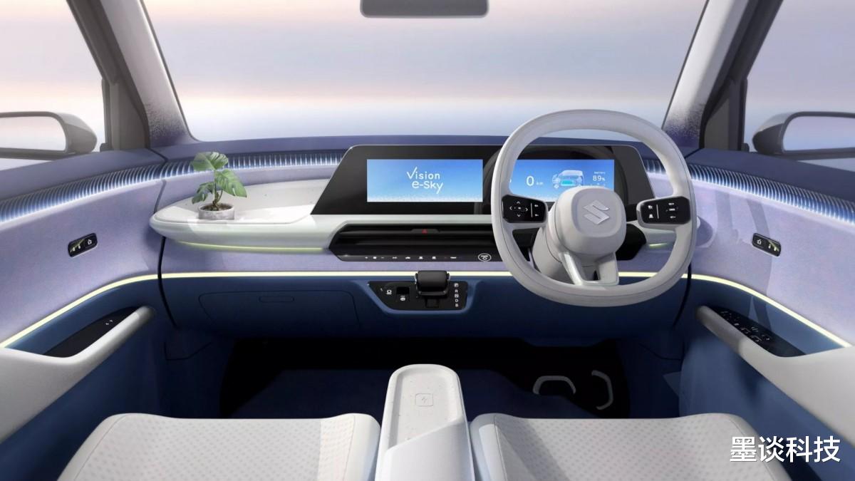 Vision e-Sky严格遵循日本轻自动车规格,车身尺寸为长3395毫米、宽1475毫米、高1625毫米,比现代MINI Cooper更为紧凑。为在有限尺寸内最大化空间利用率,铃木采用了"高顶"设计理念。这种方正的外观造型虽不追求视觉美感,但有效优化了车内空间布局。
