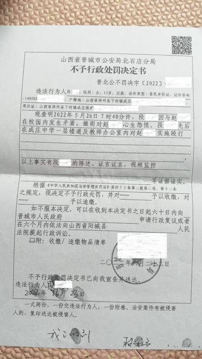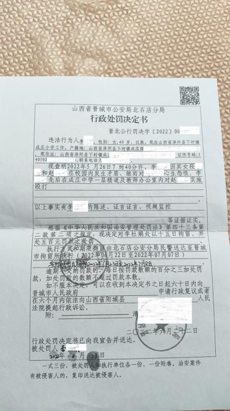 三、冲突升级:校园内的殴打事件与警方处置根据晋城市公安局北石店分局出具的法律文书,2022年5月26日早上7点40分,段某煊的母亲李某娟因此前矛盾,借口让赵某茹离开教室,与段某煊一起,先后在学校一层楼道、班主任办公室门口、教师办公室里对赵某茹实施三次殴打,监控显示晋女士的女儿未曾还手。