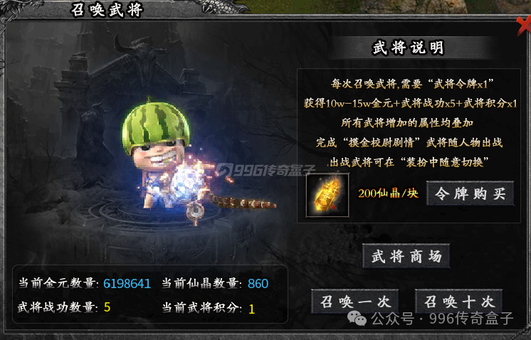 召唤武将是这个服的重要玩法之一,完成摸金校尉的剧情任务后,武将就能随人物出战了!每次召唤武将需要武将令牌,令牌刷怪会掉,也可以用仙晶购买。召唤武将还会获得10万-15万不等的金元、武将战功和武将积分,积分可以在武将商城购买材料、武学还有各种武将!