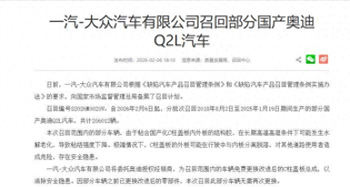 根据公告,一汽-大众自2026年2月6日起,分批次召回2018年8月2日至2025年1月19日期间生产的部分国产奥迪Q2L汽车,共计206012辆;福特自即日起,召回2025年8月5日至2025年11月27日期间生产的部分林肯航海家汽车,共计1706辆;极氪自2026年3月6日起,召回生产日期从2021年7月8日至2024年3月18日期间生产的部分极氪001WE版汽车,共计38277辆;蔚来自即日起,召回2018年3月16日至2023年1月16日期间生产的ES8、ES6和EC6纯电动汽车,数量高达246229辆。