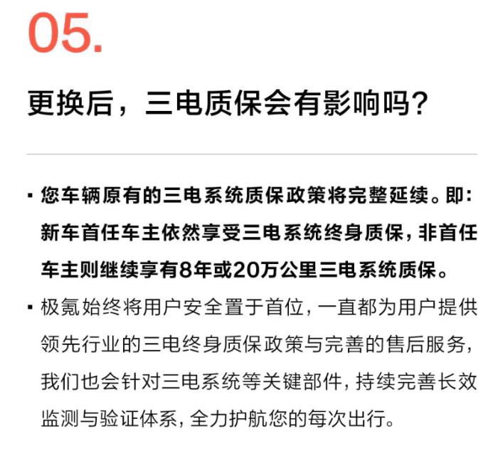 极氪在发布公告的同时,就第一时间回应了消费者的相关疑问。比如在召回说明中,极氪明确了涉及的召回车型,具体启动时间和处置措施。而在一些权益保障方面,极氪更是拿出了很大诚意。比如直接免费换全新电池,并提供免费取送车服务。更重要的是,在更换电池后,车主依然可以完整享受行业顶格的三电质保权益——新车首任车主享受三电系统终身质保,非首任车主享受8年或20万公里三电质保。还有蔚来在召回过程中同样给出了切实可行的解决方案和权益保障,比如通过远程升级(OTA)技术,免费为召回范围内的车辆升级软件至Aspen 3.5.6、Alder 2.1.0或更高版本等。