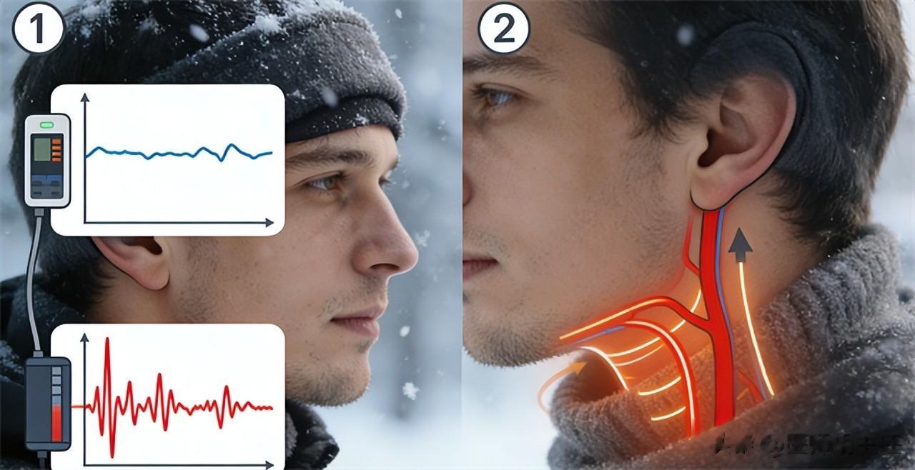 《美国高血压杂志》的一项研究显示,冷刺激下交感神经活性明显增强,血浆去甲肾上腺素水平升高,同时平均血压上升、血小板功能增强,这意味着血管更易收缩、血液更易凝聚,为血栓和脑梗埋下隐患。