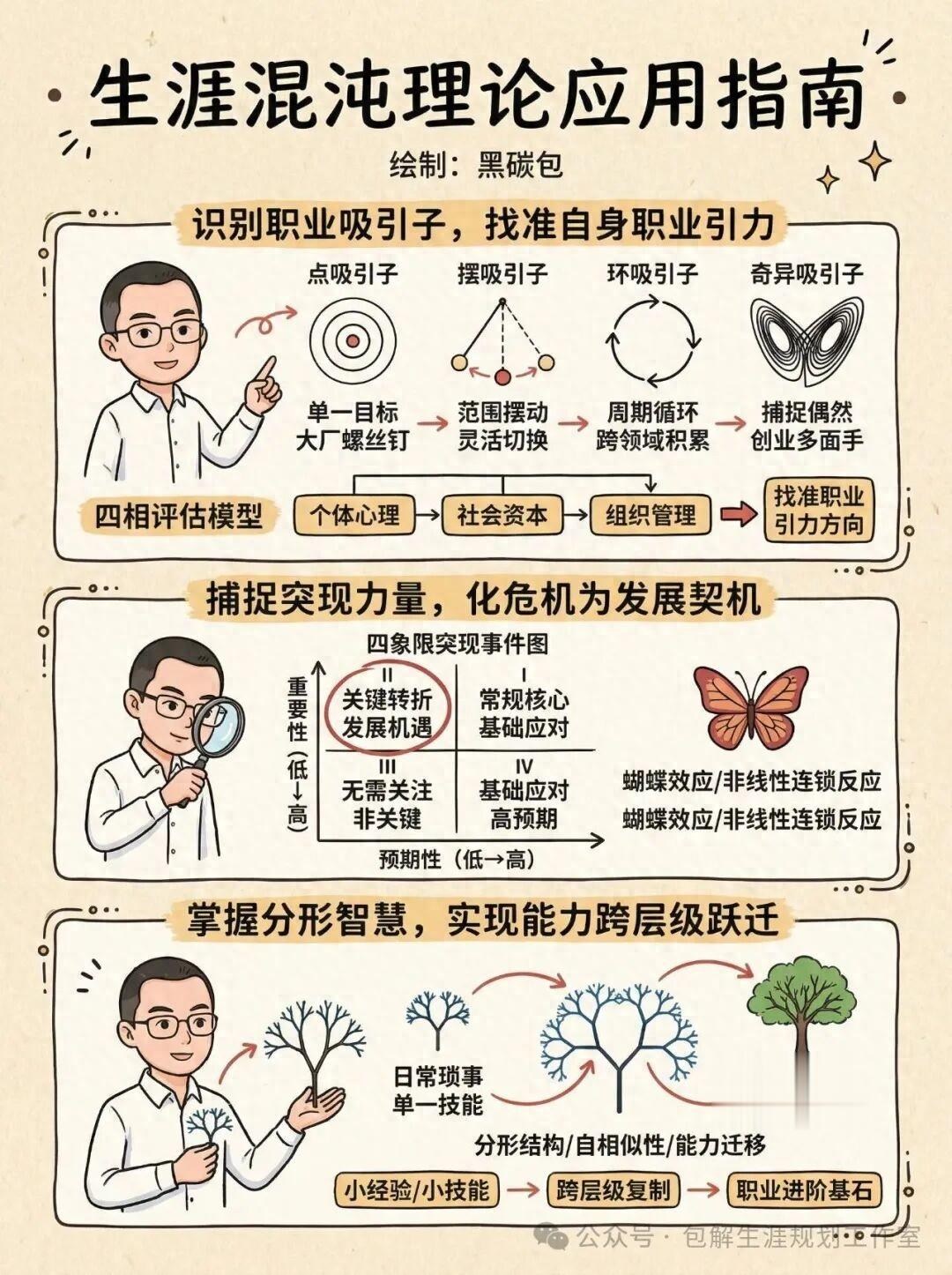 稳健型人格,大多偏向点吸引子或环吸引子,想要在不确定性中立足,关键是深耕专业,构建不可替代的核心能力壁垒;创新型人格,更偏向奇异吸引子,适合在混乱的边缘寻找机会,从行业变革、技术创新中捕捉新的职业可能,让自身的职业引力与外部场域同频。策略三:修炼机缘捕捉力,建立“机会雷达”