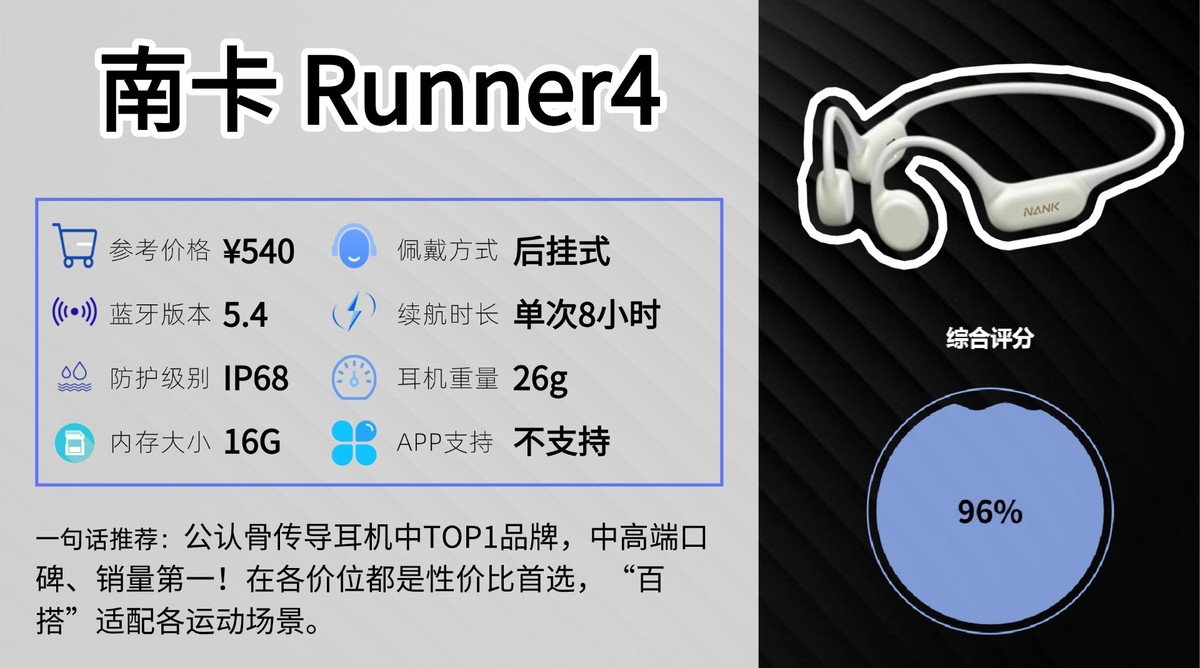 南卡在运动耳机市场里属于“专业做运动体验”的路线,不靠堆华丽参数,而是把佩戴、防水、稳固这些运动者真正需要的细节做扎实。它在骨传导技术上积累得比较久,对跑步、健身、户外使用都有针对性的研发。Runner4属于偏旗舰级的位置,但价格比同类型高端机更亲民,定位是“高性能但不浪费配置”的运动主力款。