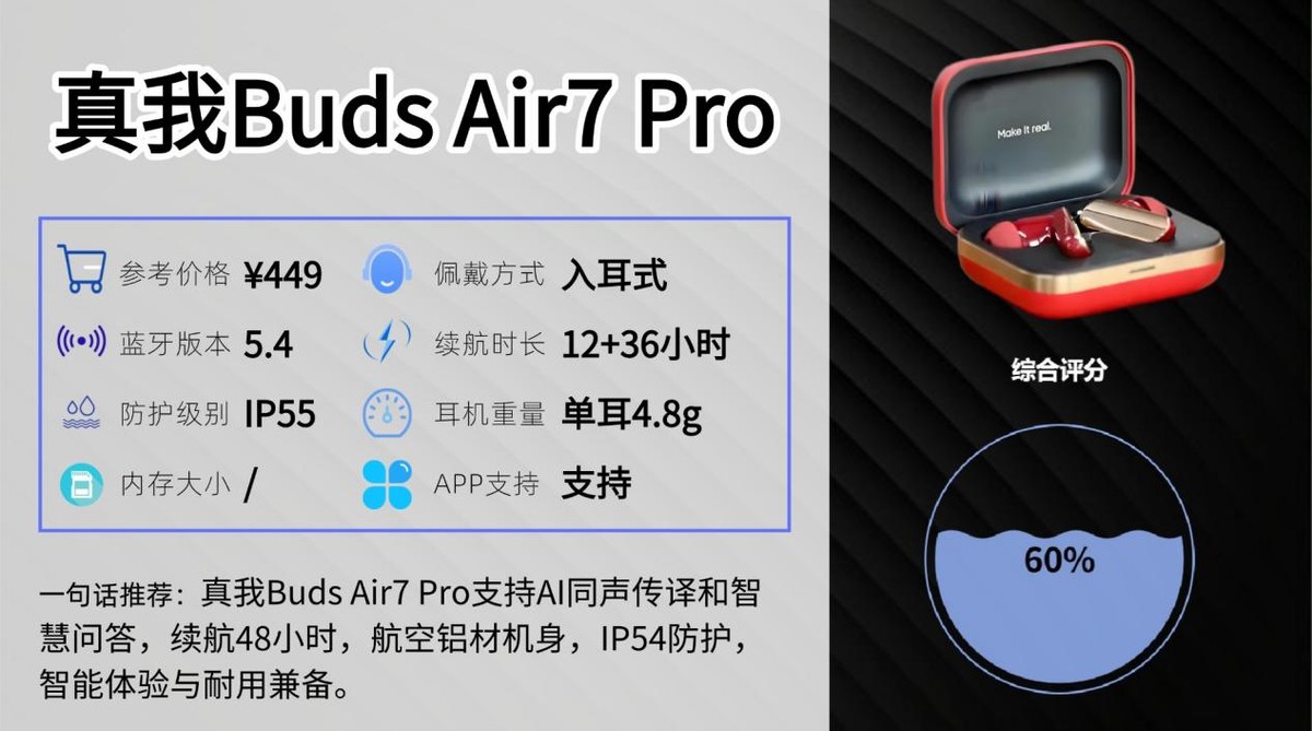 真我(Realme)在耳机市场属于中高性价比定位品牌,近年来在智能功能和运动耳机研发上经验逐渐丰富。Buds Air7 Pro在品牌中定位为智能降噪与多场景应用兼顾的旗舰真无线耳机。