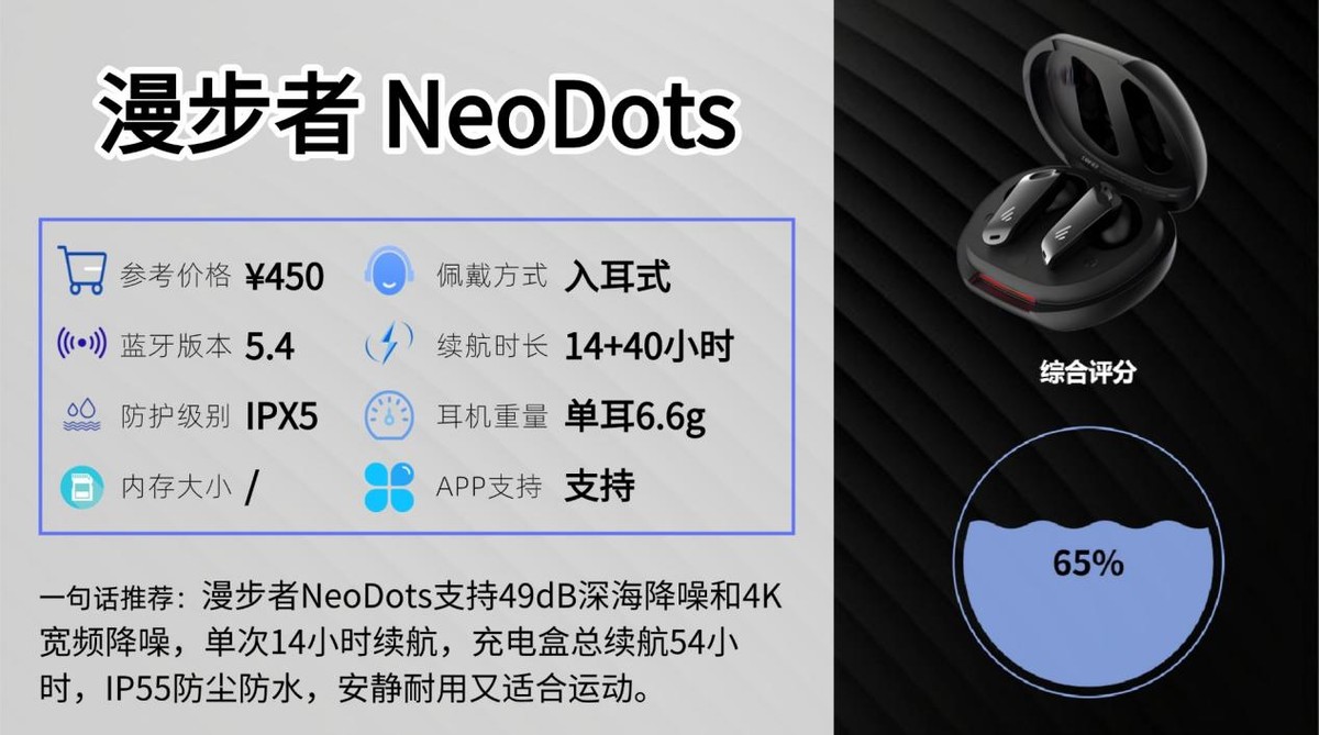 漫步者作为国内知名音频品牌,在入耳式和真无线耳机市场有丰富经验,尤其擅长性价比高的运动耳机产品。NeoDots在品牌中定位为降噪运动耳机,兼顾音质与户外耐用性。