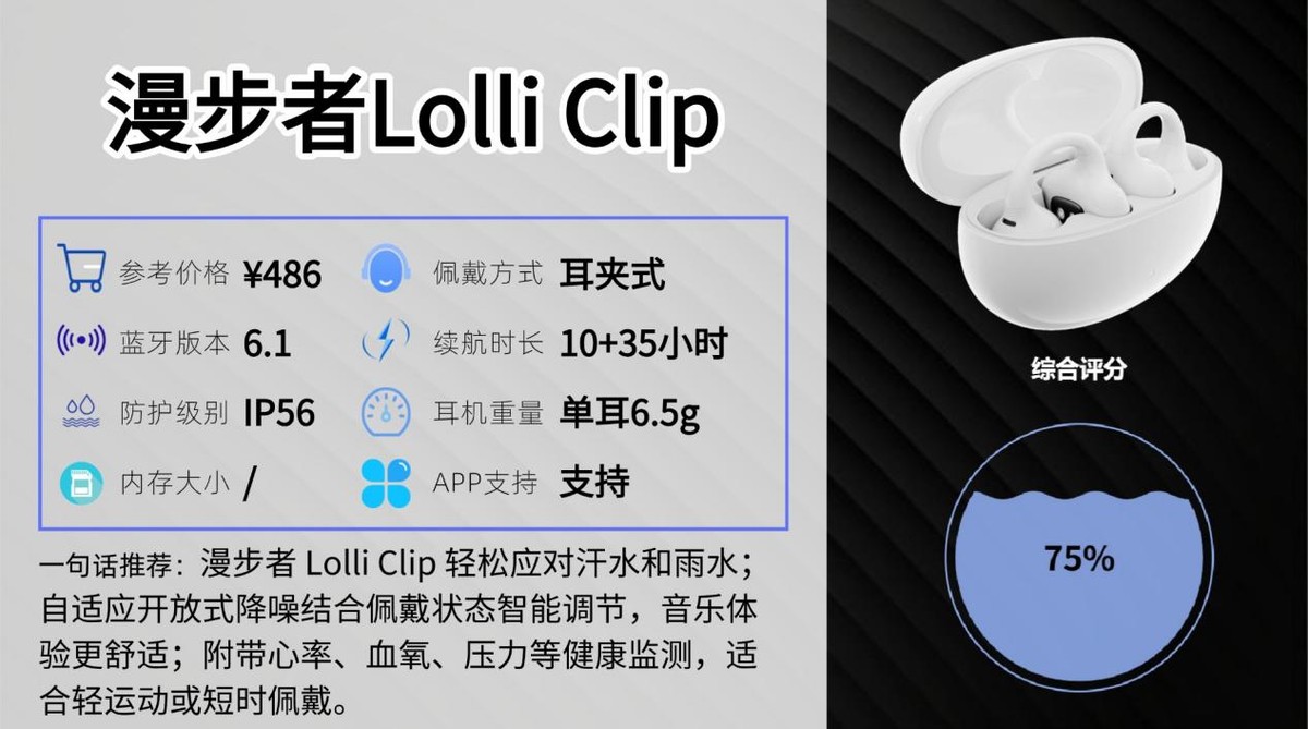 漫步者在耳机市场以性价比高、音质均衡著称,对于运动耳机有一定研发经验。Lolli Clip在漫步者产品线中定位为轻量便携、日常和轻运动兼顾的开放式耳机。