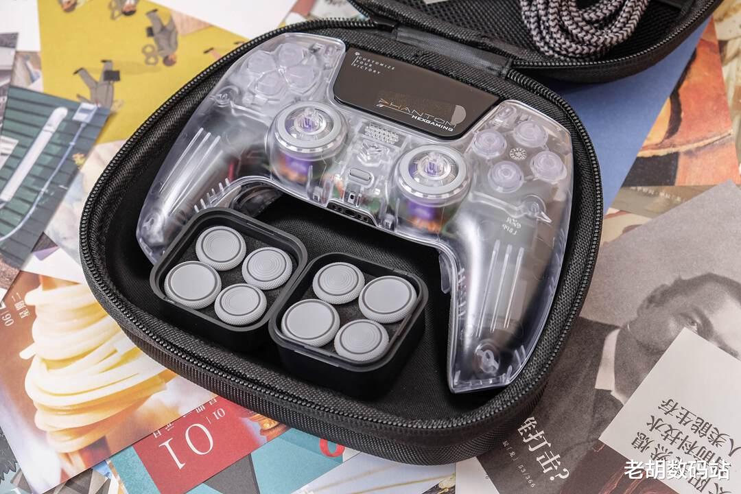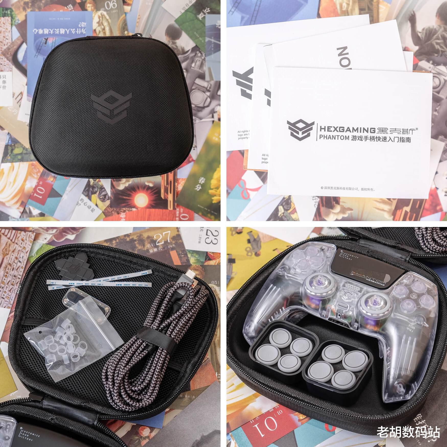 外包装就不多做介绍了,直接看看包装清单:除了硬盒收纳盒和手柄之外,还带有HEX霍尔摇杆V3调节控制器、8合1可互换蘑菇头收纳盒、编织数据线、快速入门指南、保修卡和黑克斯品牌卡。