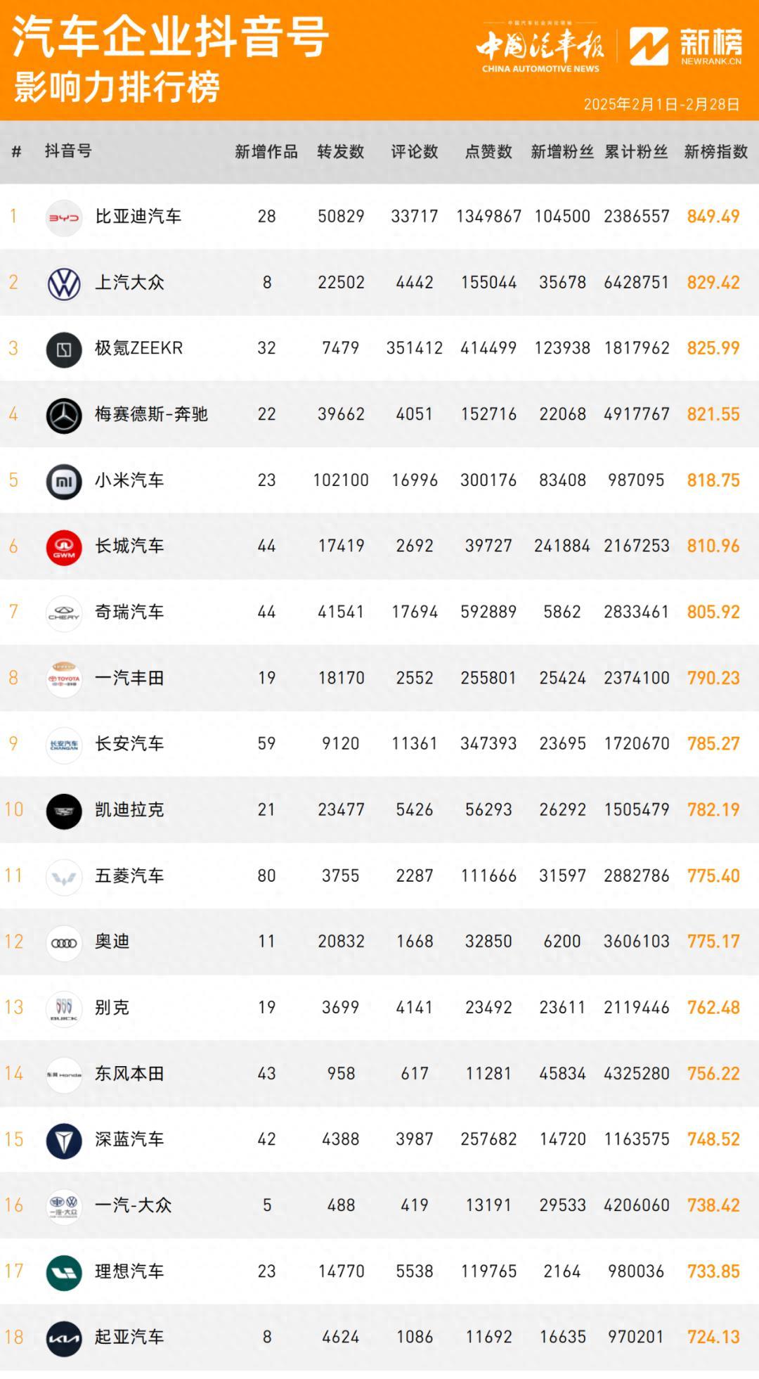 其实,汽车营销早就不是简单的电视广告、线下门店那一套了。在信息爆炸的时代,消费者注意力越来越碎片化,传统的营销方式越来越难以奏效。抖音,作为一个日活用户数以亿计的短视频平台,自然成为了兵家必争之地。2月份的车企抖音营销战,就给我们上演了一出精彩的大戏。比亚迪一骑绝尘,极氪借势亚冬会,小米靠雷军个人IP强势出圈,奇瑞则用温情路线打动人心……每个车企都在寻找自己的独特“流量密码”。
