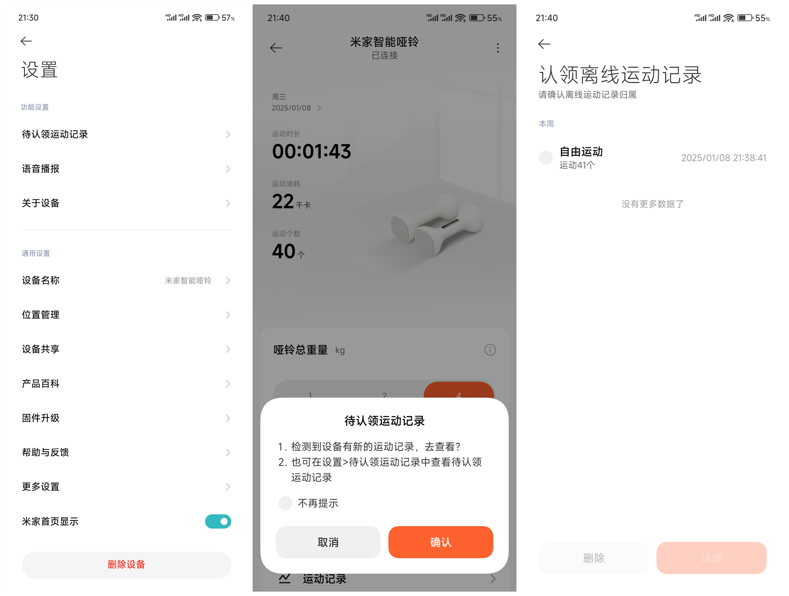 在设置里面有一项比较实用的功能-待认领运动记录,该功能的应用条件是在没有连接米家APP的离线状态下开启哑铃进行训练,哑铃自行记录下来运动数据信息,待哑铃关机等下次连接成功米家APP后,就会出现认领上次离线的运动记录信息,这样无论是否连接都可以做到记录无缝衔接。