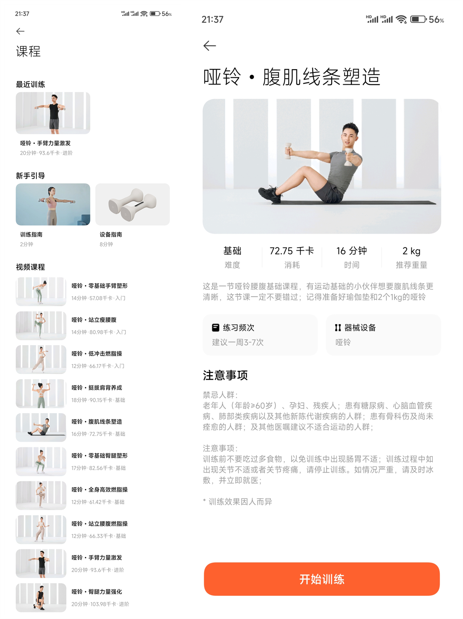 课程里根据不同训练强度提供了10种训练课程,个人可以参考自身实际情况选择课程进行针对性训练。每个课程里详细介绍了训练特点、效果、时长周期和注意事项等信息。