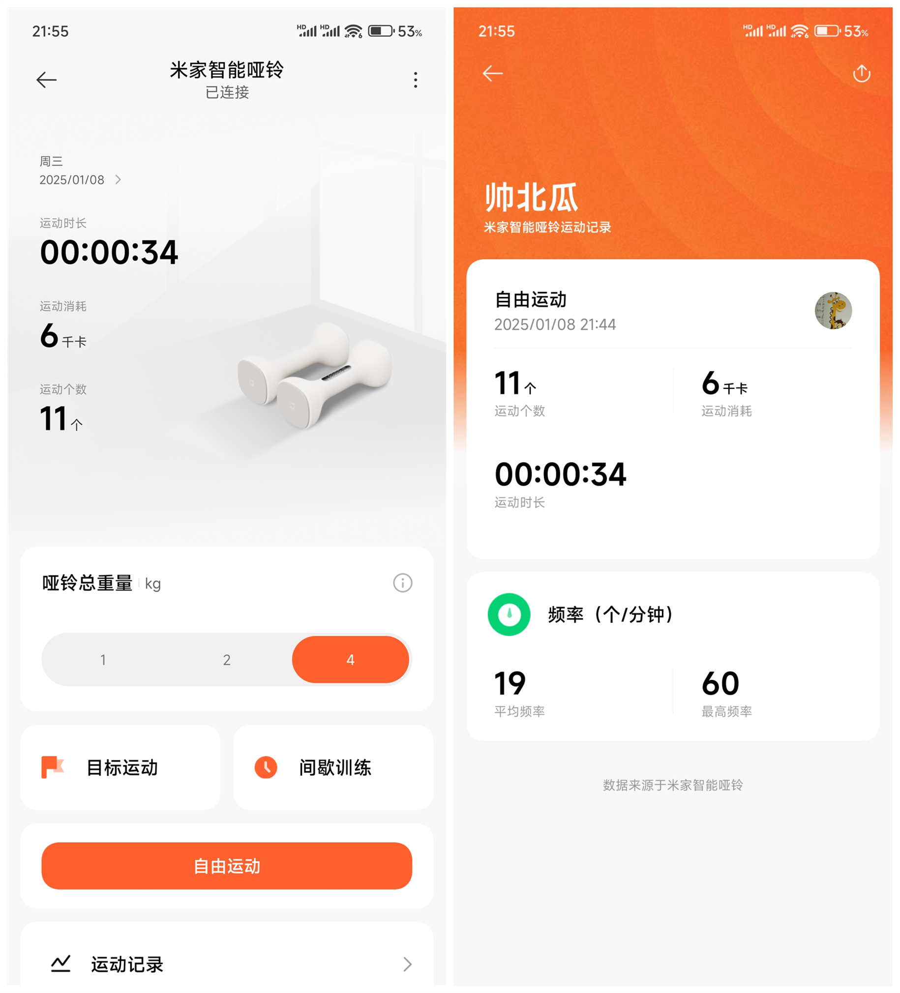 运动状态信息记录最后一次运动记录情况,包括哑铃运动时长、卡路里消耗和运动个数,点击进入后除了显示以上数据外,还可以查看平均频率和最高频率。