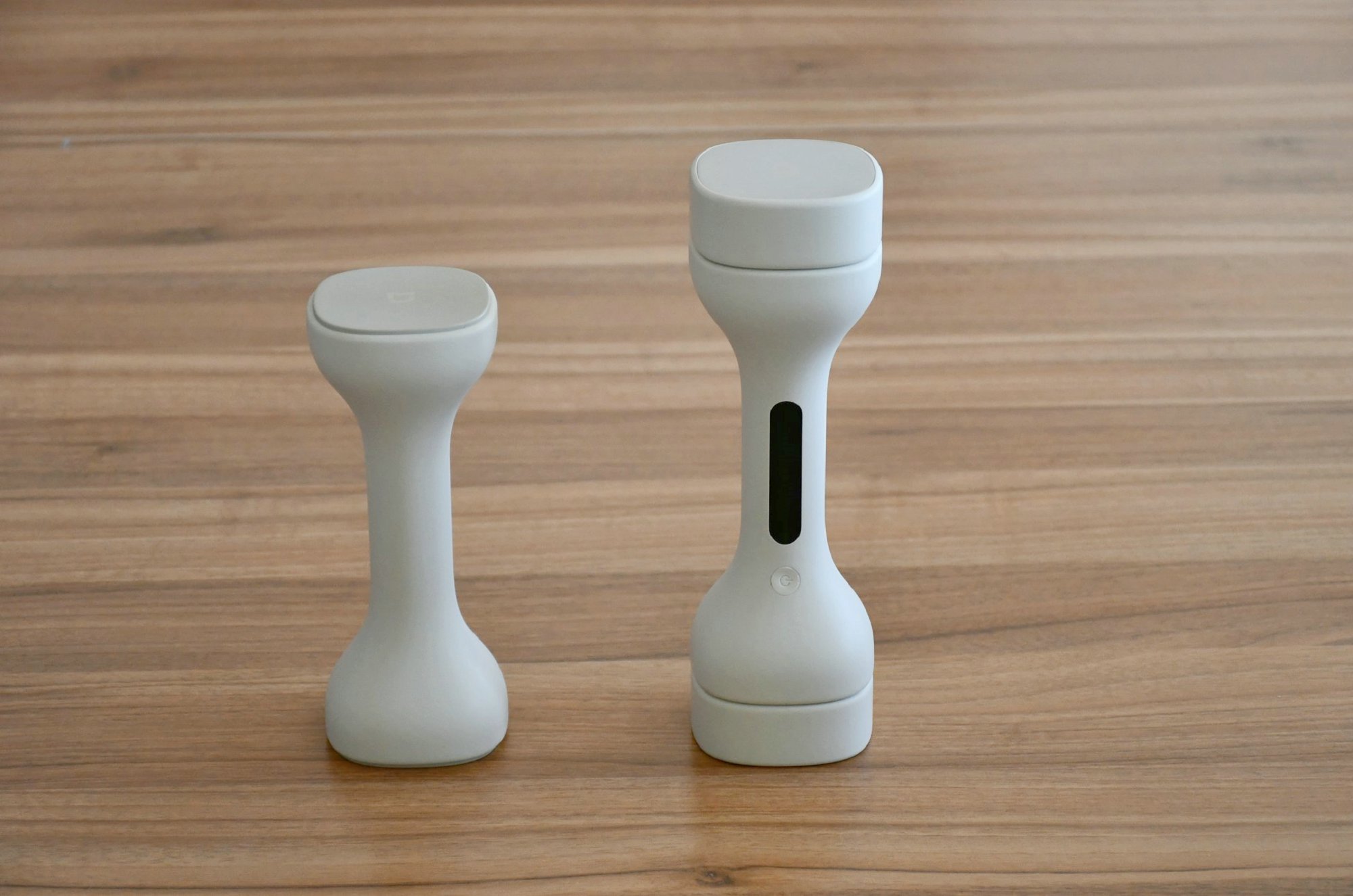 两只哑铃外观有明显的差别,一只手柄位置带有一长条状的显示屏,作为主手柄。另外一只不带显示屏,只是一只普通哑铃,作为副手柄。通过实测,单只哑铃重量约为1008克,这与官方介绍的约1.0千克基本相符。