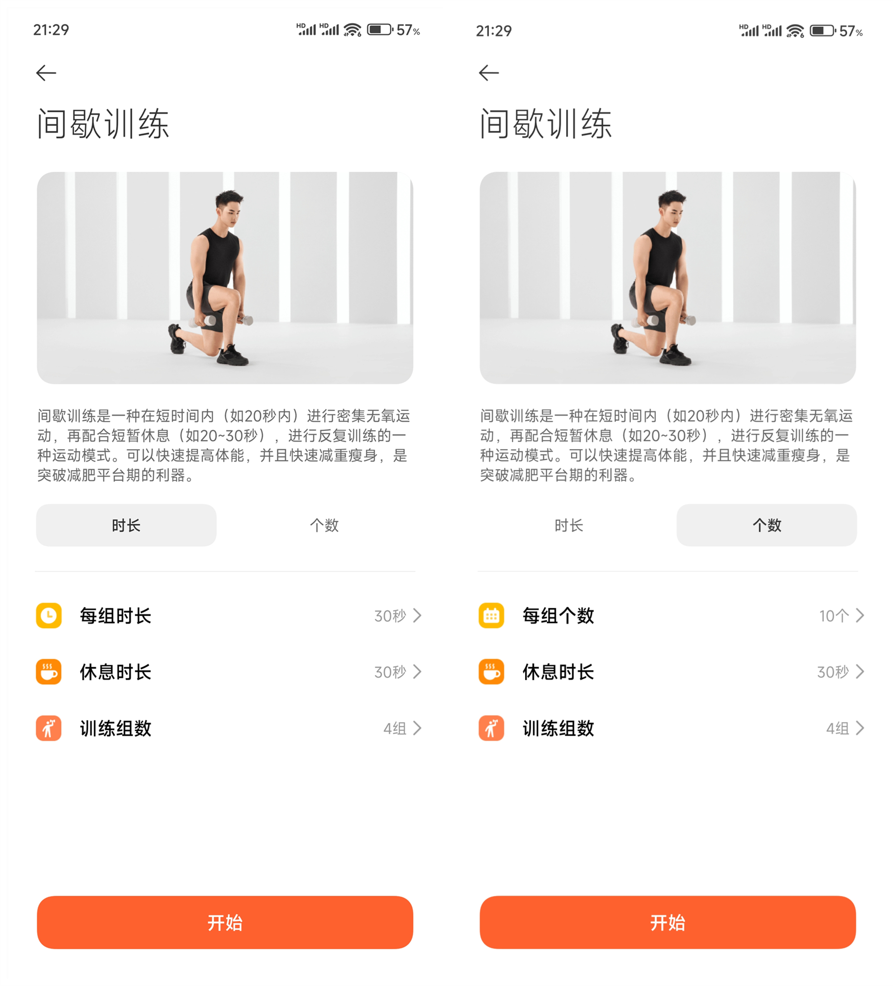 间歇训练里可以设置每组时长/个数、休息时长、训练组数,与上面一样,可以选择所提供的不同强度的数值。
