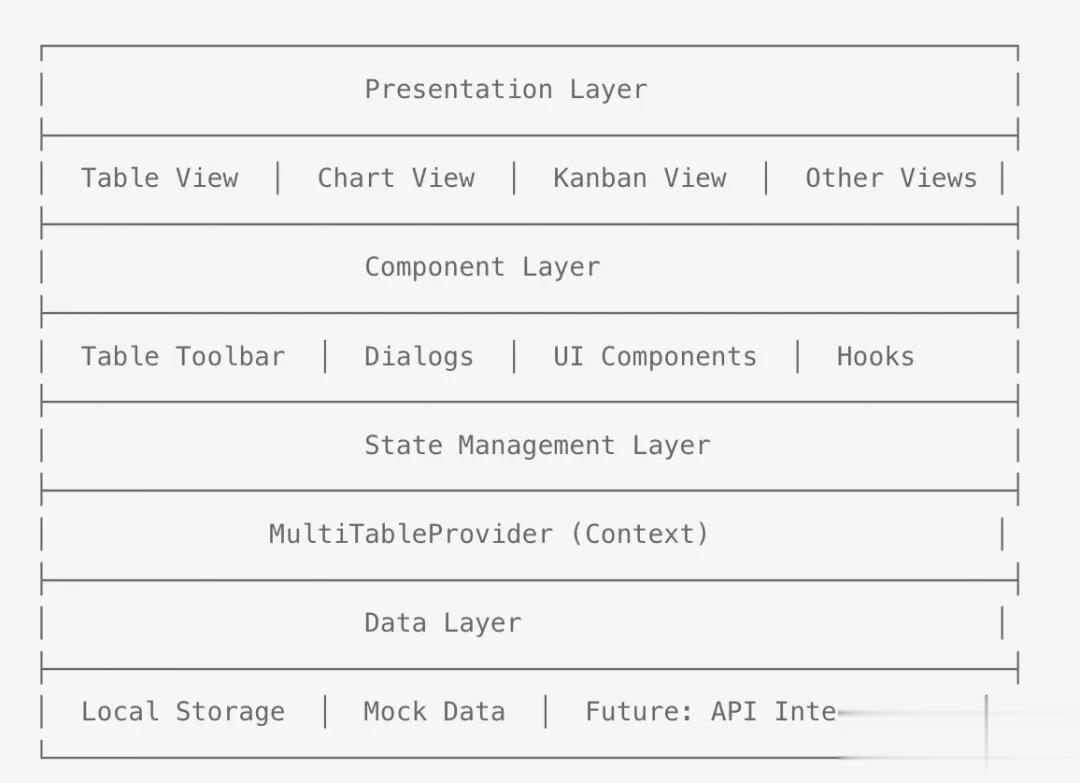 interface ColumnConfig { id: string // 列标识 title: string // 列标题 width: number // 列宽度 type: "text" | "select" | "date" | "user" | "progress" | "checkbox" // 列类型 editable: boolean // 是否可编辑 visible: boolean // 是否可见 options?: string[] // 选项(用于select类型) }为了更直观的让大家了解数据关系,我花了一个数据模型分层图: