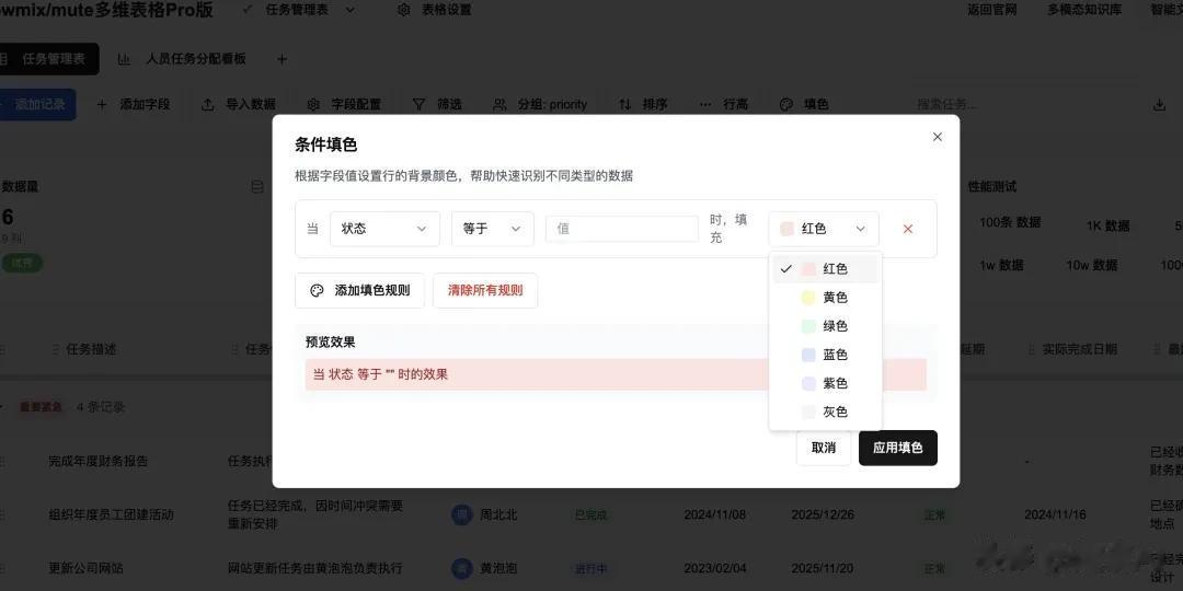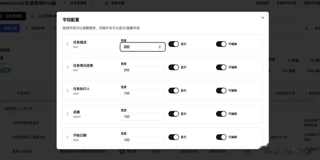 TableConfig (表格配置) ├── columns: ColumnConfig[] (列配置) ├── data: TaskData[] (数据行) ├── filters (过滤条件) ├── colorRules (颜色规则) └── settings (表格设置) TaskData (数据行) ├── 基础字段 (id, title, description) ├── 状态字段 (status, priority) ├── 时间字段 (startDate, dueDate, completedDate) ├── 人员字段 (assignee) └── 自定义字段 (通过 [key: string]: any 支持)5. 多维表格组件视图的实现