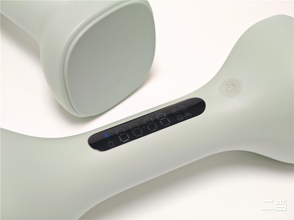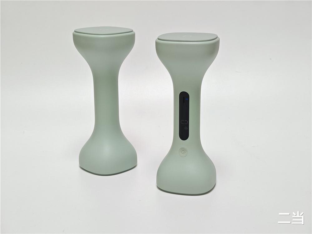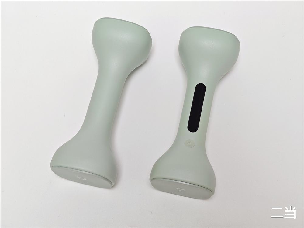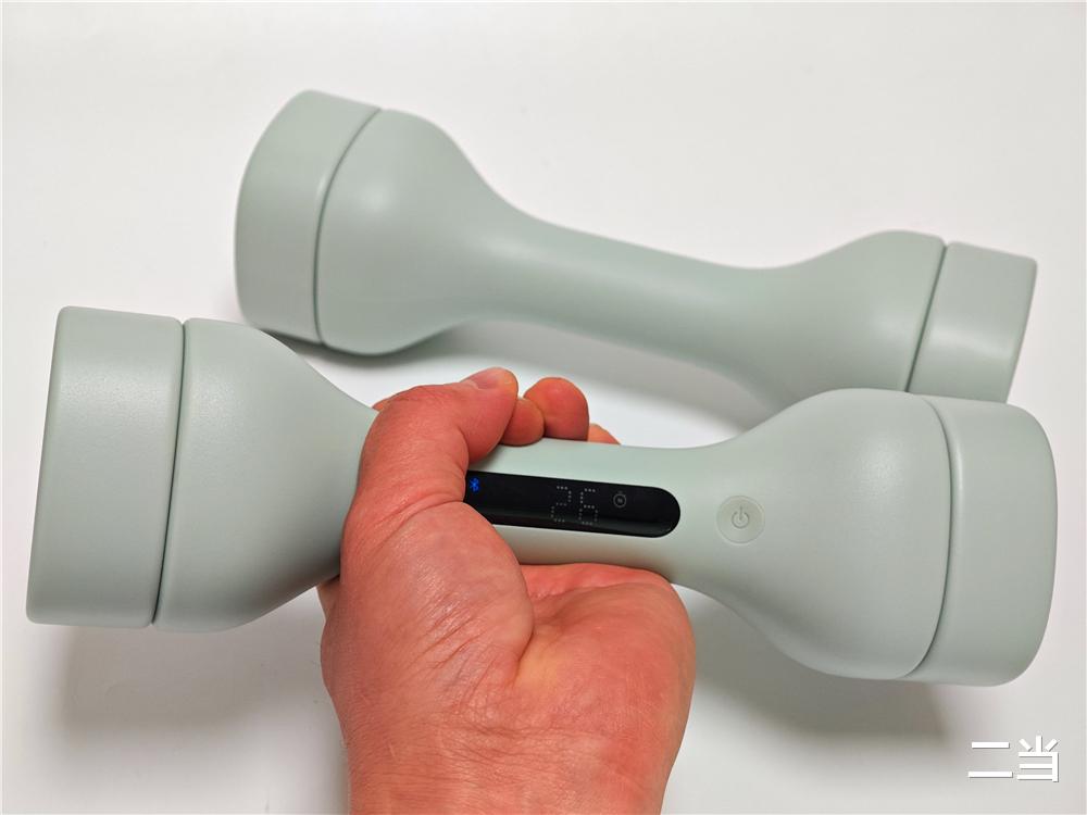哑铃手柄有主和副手柄之分,主哑铃手柄中间集成黑色LED点阵屏,可以高清显示训练个数、训练时长、卡路里消耗等多项运动数据,不需要频繁查看手机,只需低头看一眼哑铃,就能掌握自己的训练进度。屏幕一侧预留一颗开关机/功能切换按键,采用防误触微凹设计,可单手轻松切换屏幕显示。副哑铃为纯哑光材质,两端超椭圆防滚设计使立放/卧放稳定性提升。