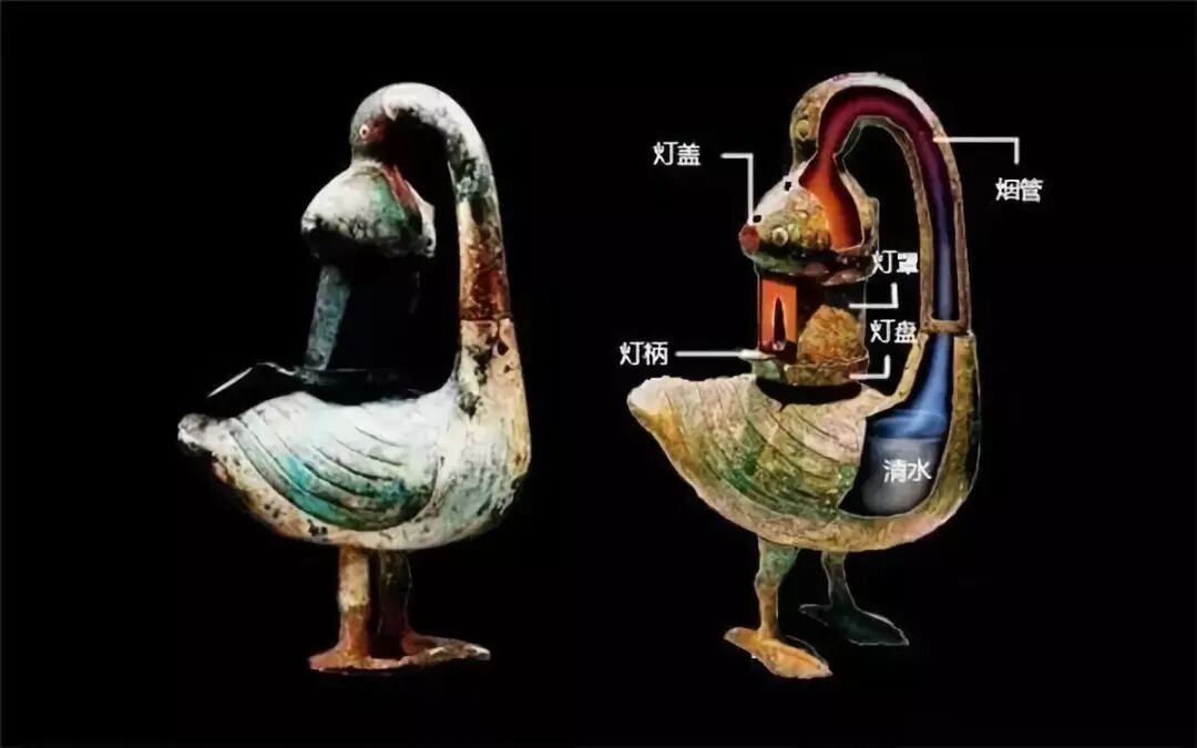 灯油点亮后产生的油烟会顺着大雁颈部导入大雁的腹内,雁腹盛有清水,