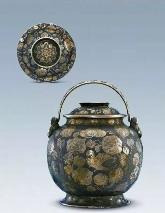 银罐纹饰鎏金,器身满饰珍珠地纹。