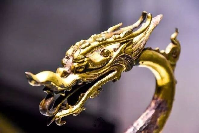 这件铜龙是铁质的,通体鎏金,身体细长,两只有力的前脚紧扣地面,