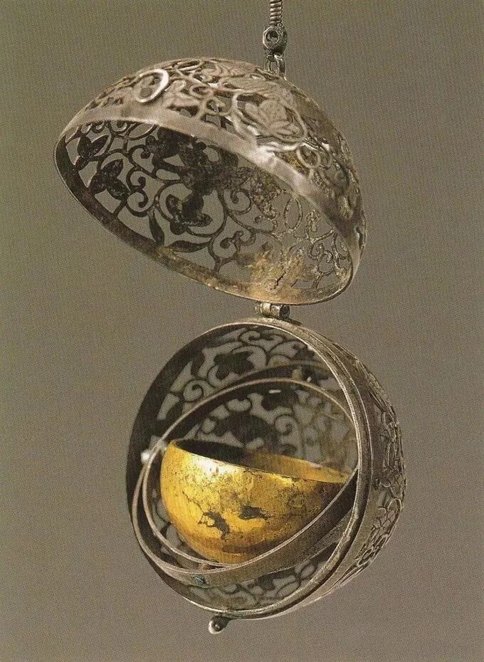 这种奇妙的现象是由于香囊内部有双轴相连的同心圆机环,内层机环分别与外层机环和金盂相连。