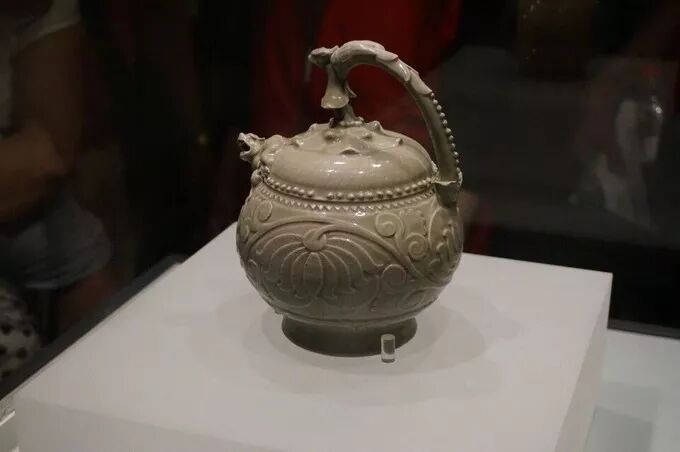 这件倒灌壶身刻有凸起的缠枝牡丹,下方装饰有一周仰莲瓣,纹饰简洁明快。