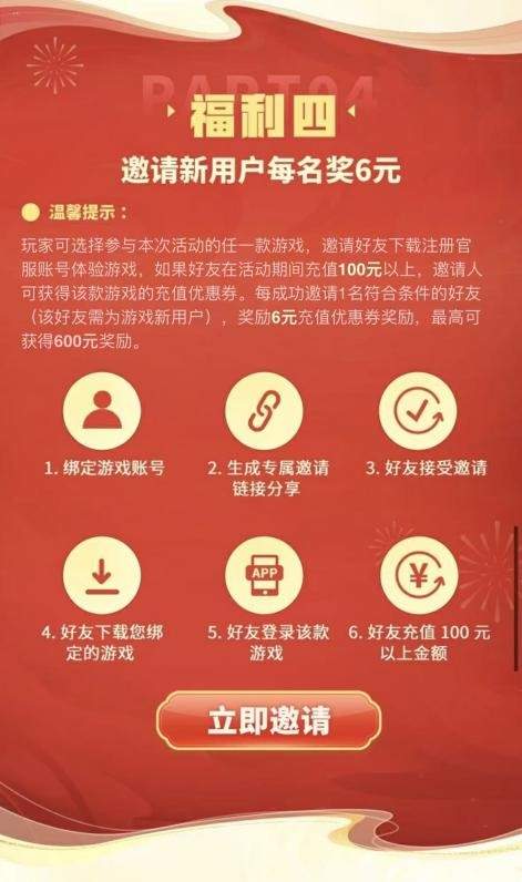 最后是老玩家最爱的邀新赚券环节,这才是薅羊毛的重头戏。生成你的专属邀请链接,拉上未玩过这款游戏官服的朋友入坑。只要他注册新号并在活动期间充够100r,你就能拿6r充值券,最多能攒到600r!对很多喜欢组队开黑的玩家来说,简直是双赢。