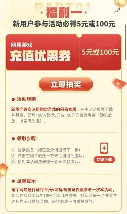 第一波先给所有新玩家塞个见面礼。只要你是首次在指定游戏的网易官服注册账号,在活动页面下载并登录游戏,就能100%拿到5米或100米充值优惠券。比如刚入坑的萌新,登录就能领一笔起步资金,买个初始道具或者外观都很合适。