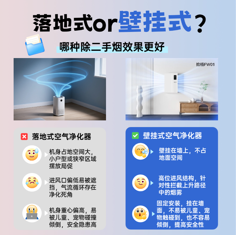 落地式的空气净化器容易把已经扩散开的烟味再吸一遍,过程慢。壁挂式的空气净化器在烟雾上升阶段就介入,能减少烟味在室内来回流动,整体残留更少。