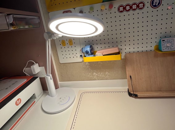 核心亮点:灯头是20.5cm的圆形设计,面光源加环光源的组合,光线均匀度符合国AA级标准,日常看书写字够亮够均匀。