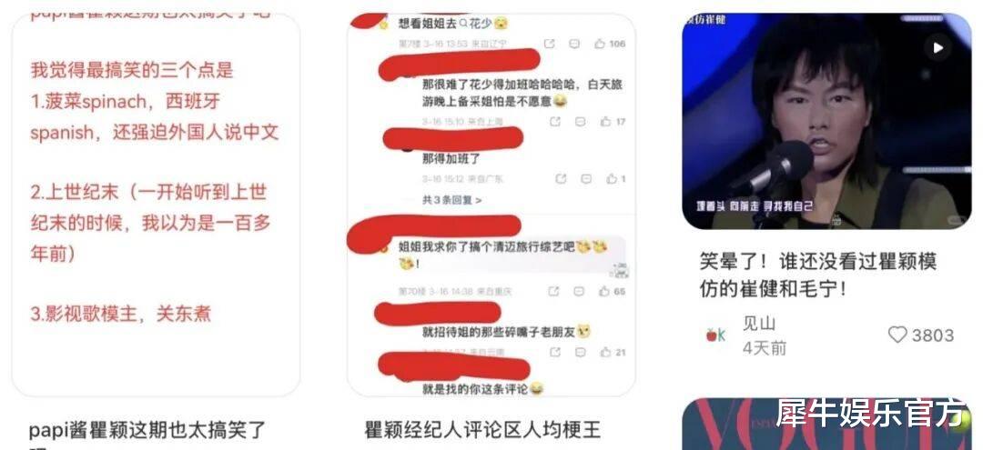 近日,54岁“上世纪末艺人”瞿颖上完papi酱《热烈欢迎》后彻底翻红,短短37分钟密集输出了“菠菜(spinach)误听成西班牙人(Spanish)”、“2.5元耳环配金霉素”、“清迈大学进修泰式普通话”等让全网笑到头掉的爆梗,随后几天有关她的婚姻状况(#瞿颖已婚#)、CP八卦(#胡兵家有瞿颖的专属卧室#)、经典作品(#瞿颖可是百变五侠#)、反卷宣言(#经纪人称瞿颖不想上班加班#)等均被微博和小红书网友热热闹闹考古和玩了个遍 ……
