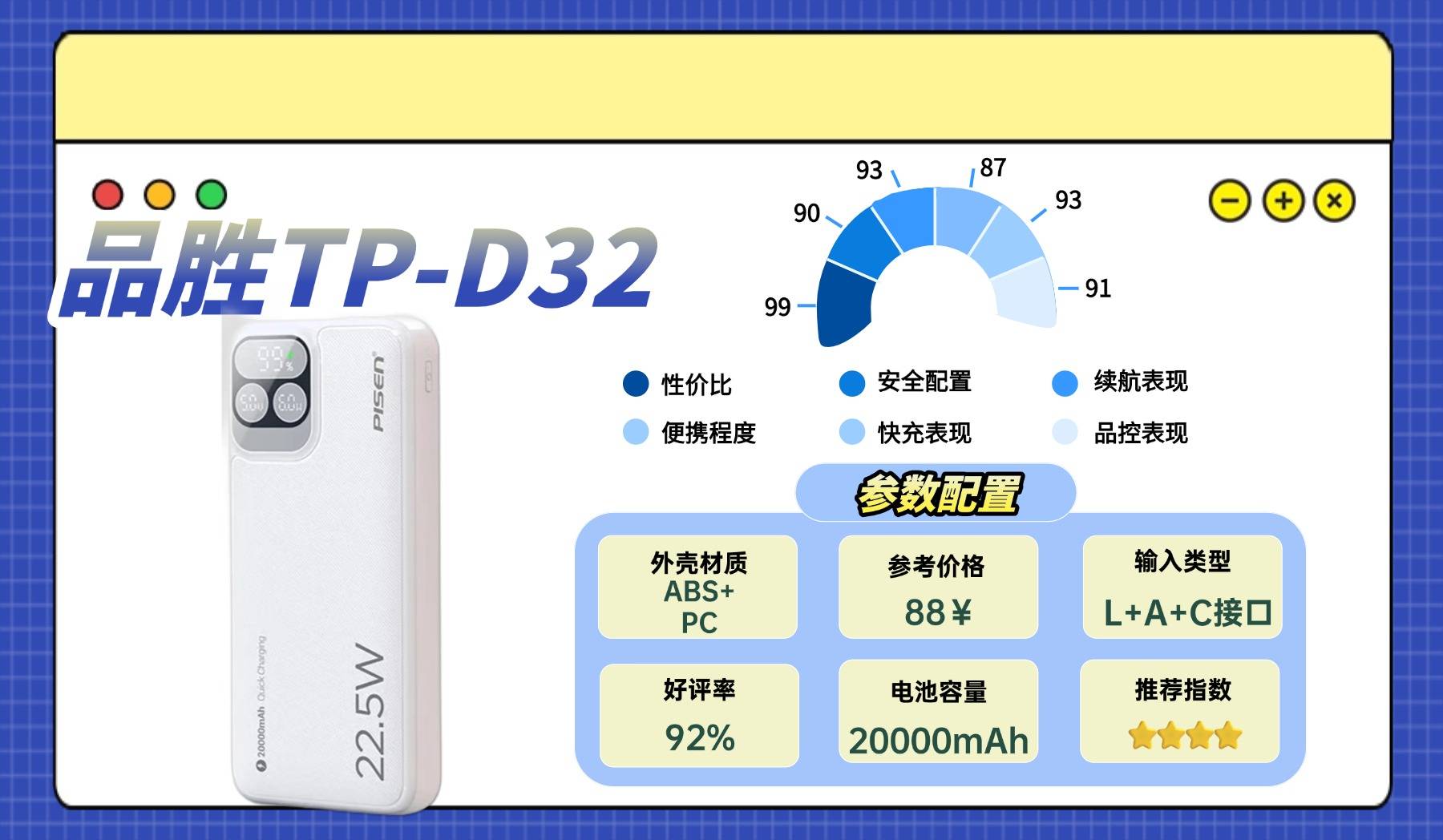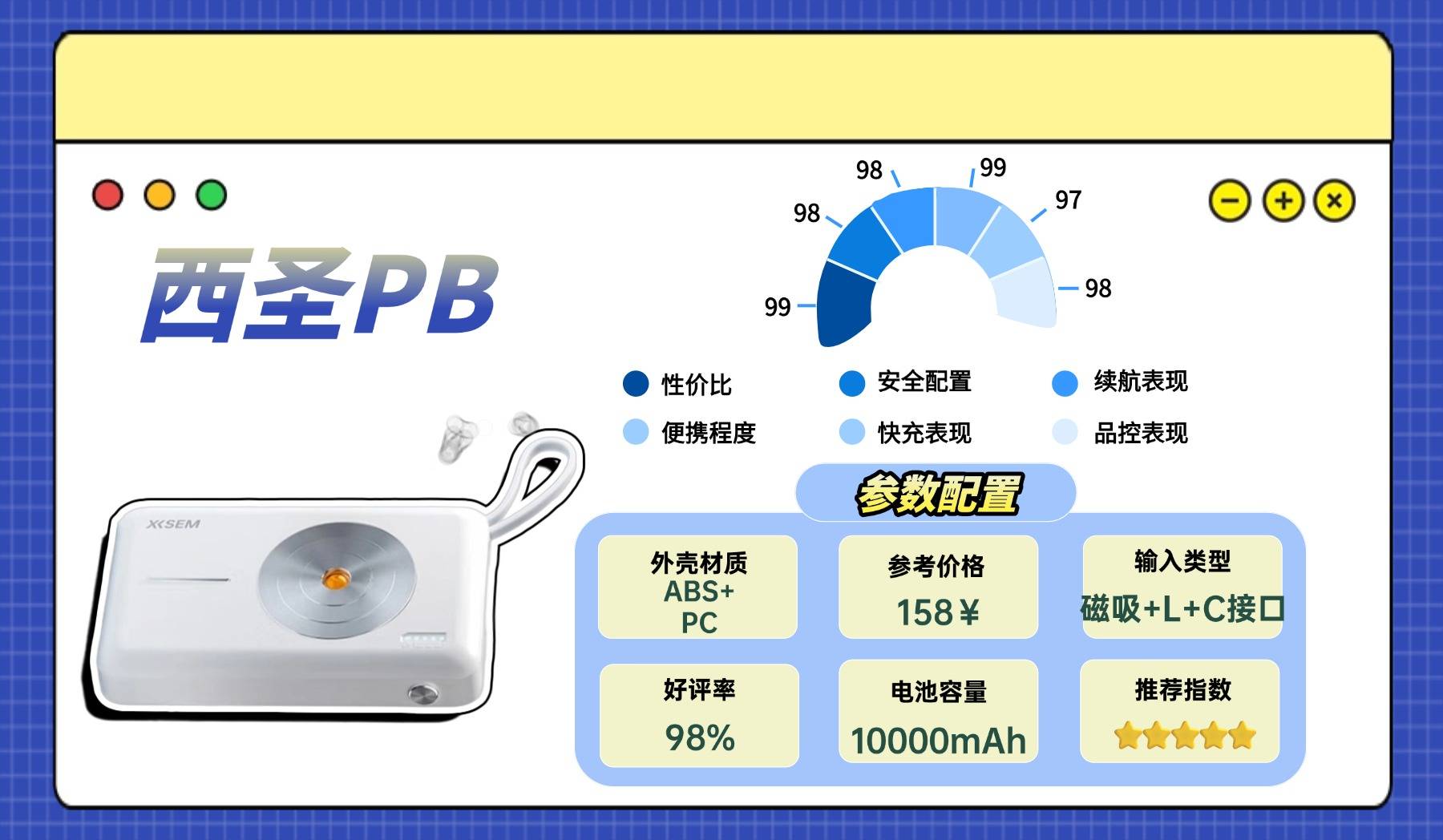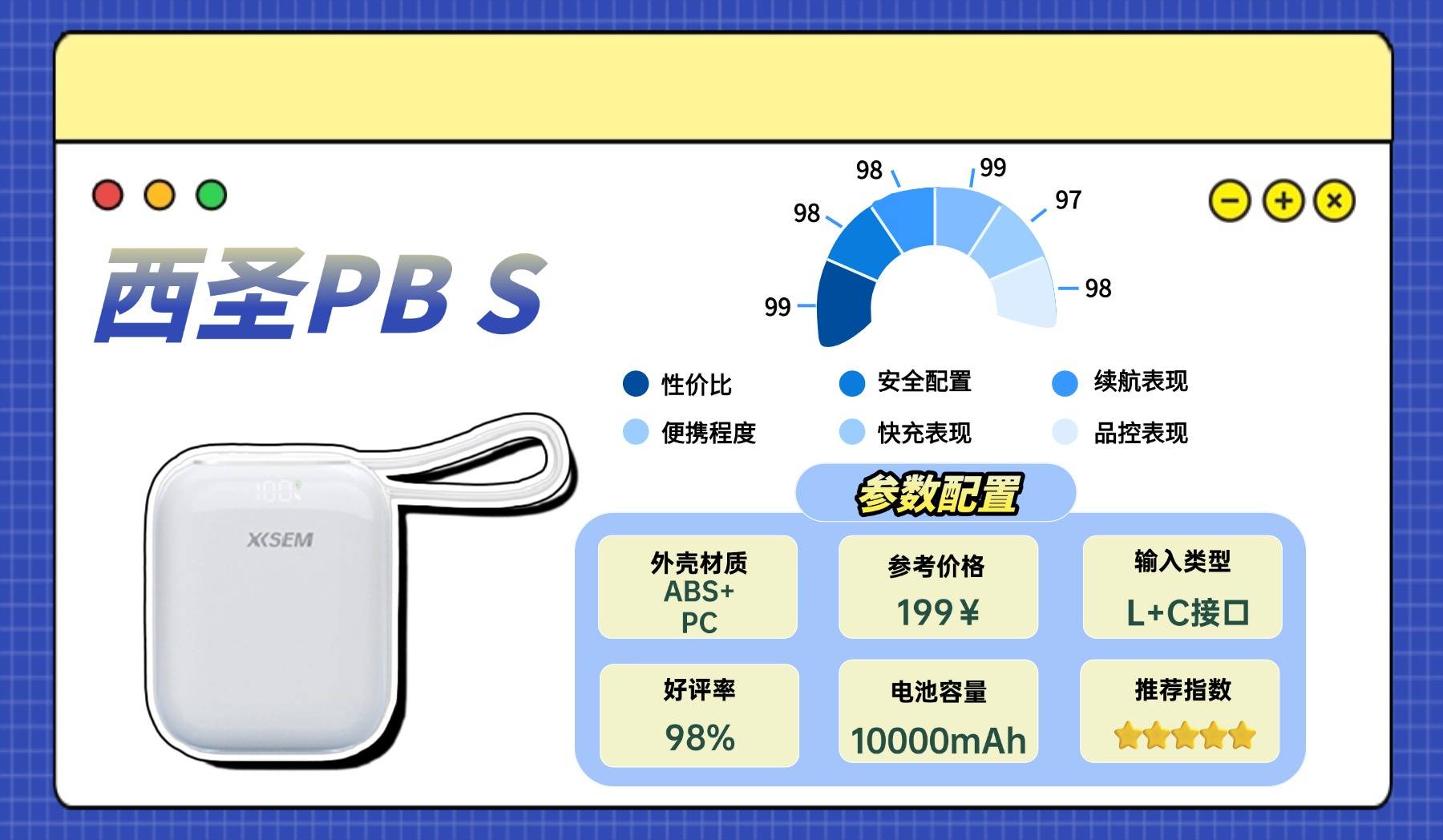 西圣PB-S自从发布以来,口碑和好感度一路高涨,成为最火爆的充电宝之一,也是众多数码博主和户外达人必备单品。西圣品牌是国内少有的因技术实力闻名的充电宝厂商,在电芯安全、快充效率和温控管理上有多年研发经验积累,对比同价位竞品,其快充输出稳定性提升116%、充电速度提升44%、电池循环寿命提升51%,在实现高功率快充的同时,将对充电设备电池的损害降低96%,完美解决了充电慢、发热量大的行业痛点,可以说是西圣PB-S充电宝目前是天花板的存在,是行业的“安全快充”性能之王,在安全性、耐用性和快充性能上多年稳居百元档充电宝前列,口碑和好评率长期领先!