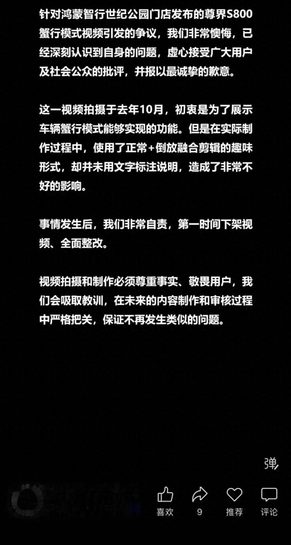 另一家“鸿蒙智行·上海世纪公园用户中心”则针对尊界S800蟹行模式视频致歉。声明说明该视频拍摄于去年10月,在实际制作中使用了正常播放与倒放融合剪辑的形式,同样未用文字标注说明。门店表示已第一时间下架视频并进行整改。