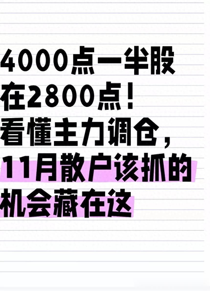 等到主力调仓结束,新的主线涨起来,再回头看4000点的震荡,只会觉得是个不起眼的起点。11月的机会,就藏在“一半股还在2800点”的分裂里,藏在主力调仓的痕迹里,更藏在“重个股轻大盘”的清醒里。别被短期波动吓住,也别错过这场“冰火两重天”里的赚钱窗口。