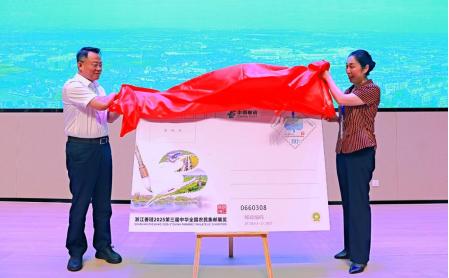 这一国家级主题邮展的开幕式上,集邮联合会副会长高洪涛的致辞,道出了农民邮展的深层意义:“善琏是农民邮展的发源地,也是‘绿水青山就是金山银山’理念的实践地。本次邮展146部450框邮集,涵盖10个竞赛类别,既有展现农耕文化的传统题材,也有记录脱贫攻坚的时代作品。邮票是国家名片,我们要让这方寸天地,成为展现乡村振兴成果的‘窗口’,让更多人看见农民的智慧与奋斗。”随后,她与浙江省邮政公司总经理方志鹏共同为印有善琏古镇风貌纪念邮资明信片揭幕。