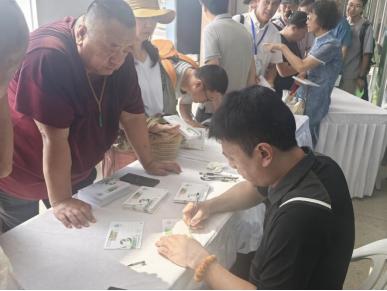 在邮集签名区,纪念邮资明信片设计师陈志皓的桌前排起长队。上海的余先生捧着一叠早年陈志皓设计的邮品,语气里满是期待:“我受母亲影响爱上集邮,这次专门来请陈老师签字。”一旁的来自湖州的集邮爱好者潘哲,是第一次参加农民邮展,他手里攥着父亲传下来的旧邮册:“我集邮才五六年,是受我爸影响。这次带了陈老师早年的作品来签字。以前总看生肖题材邮展,农民题材的特别接地气,能感受到不一样的文化温度。”