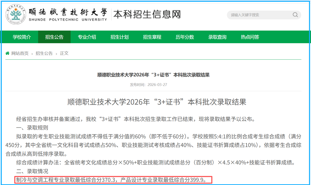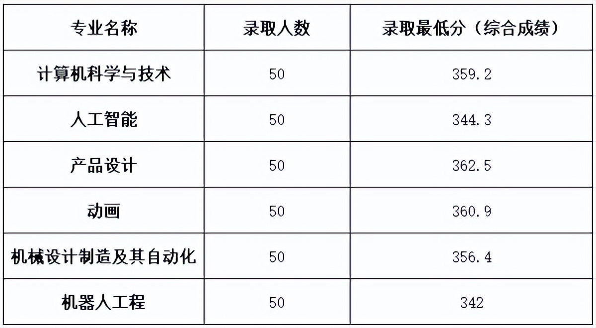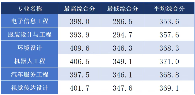 制冷与空调工程专业录取最低综合分370.3,产品设计专业录取最低综合分399.9。