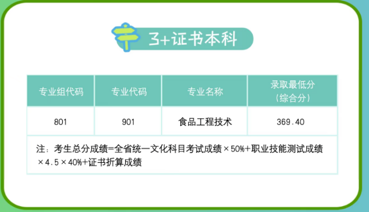 今年3+证书广轻大依旧只有一个本科专业招生,食品工程技术专业,录取最低分(综合分)369.4分。