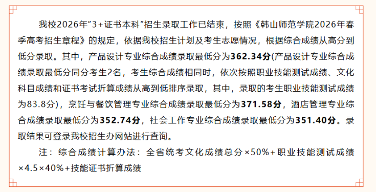 产品设计专业综合成绩录取最低分为362.34分(产品设计专业综合成绩录取最低分同分考生2名,考生综合成绩相同时,依次按照职业技能测试成绩、文化科目成绩和证书考试折算成绩从高到低排序录取,其中,录取的考生职业技能测试成绩为83.8分);