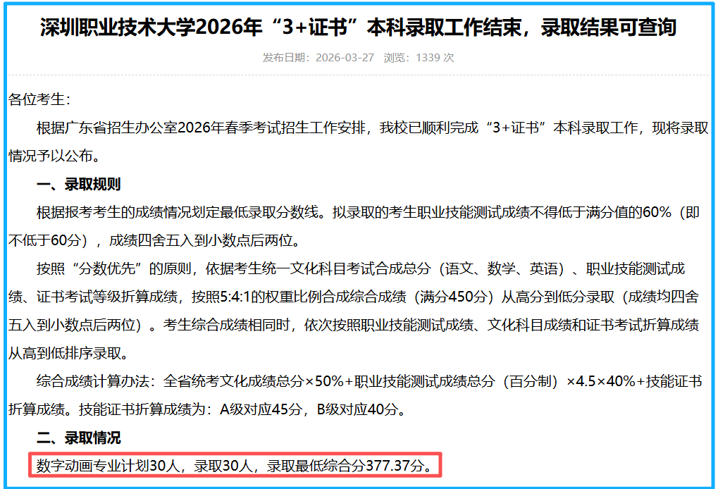 深职大2026年3+证书本科录取情况:数字动画专业计划30人,录取30人,录取最低综合分377.37分。
