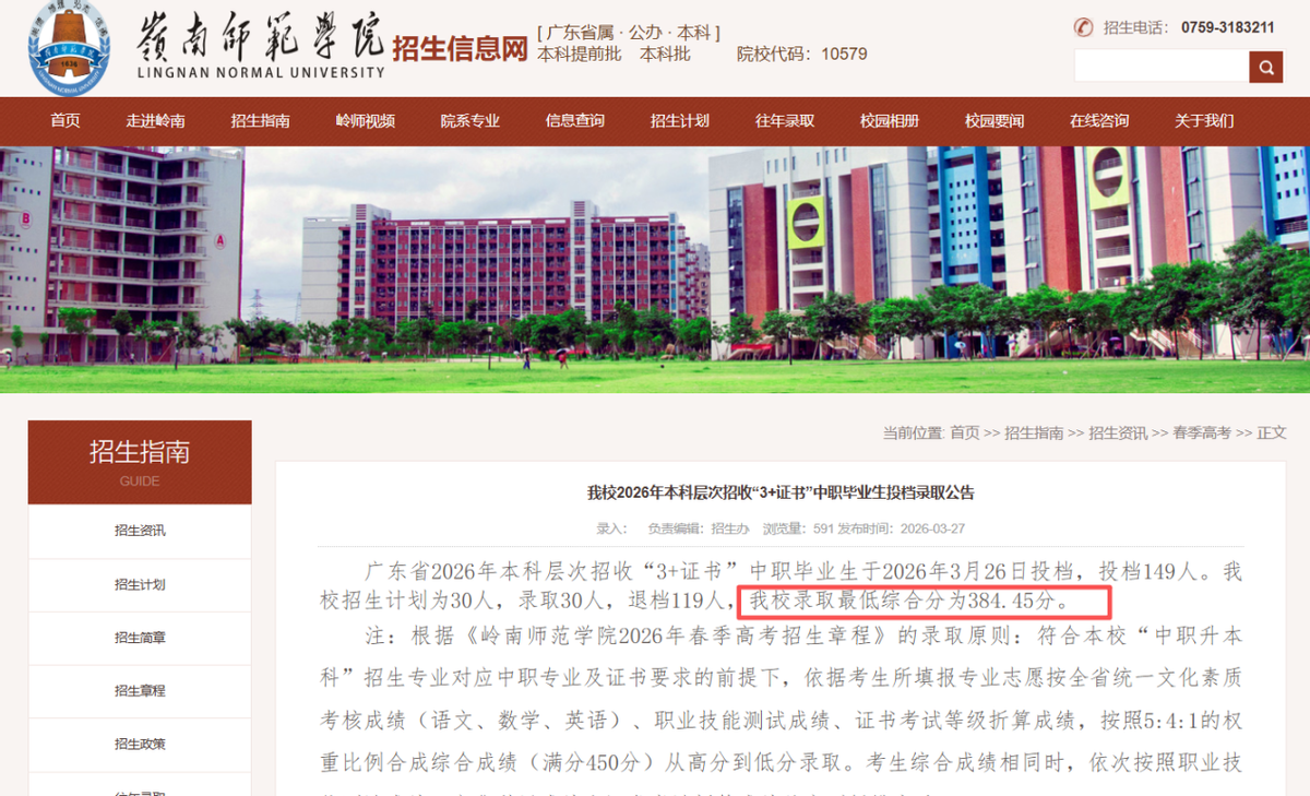 广东省2026年本科层次招收“3+证书”中职毕业生于2026年3月26日投档,投档149人。岭南师范学院招生计划为30人,录取30人,退档119人,我校录取最低综合分为384.45分。