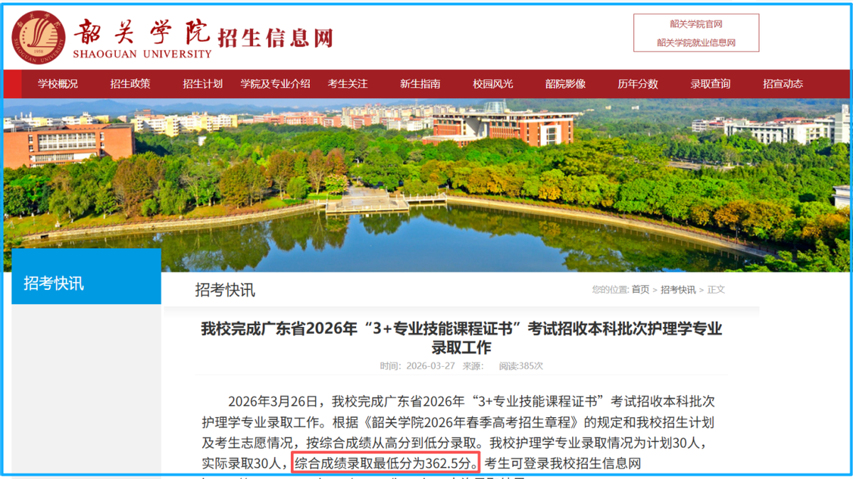 韶关学院护理学专业录取情况为计划30人,实际录取30人,综合成绩录取最低分为362.5分。