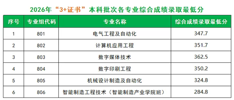 广州职业技术大学今年是广州职业技术大学升本改大后首次3+证书本科批次招生,两个专业组最低分数线均超过300分,可见竞争非常激烈。