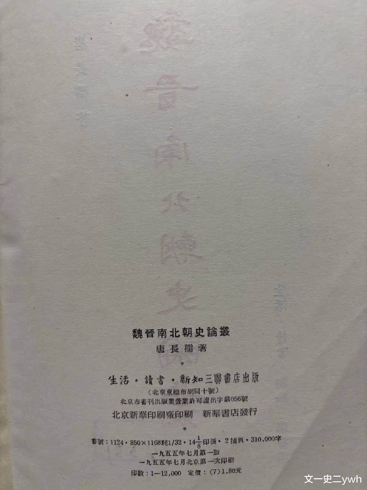 我手头上有一本前些年在孔网上购买的,史学大家唐长孺先生的《魏晋南北朝史论丛》,就是当时以生活·读书·新知三联书店名义出版的,版权页信息上显示该书为1955年7月一版一印的。